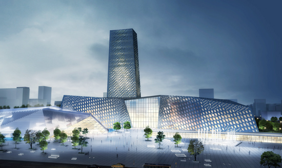 在省會(huì)文化藝術(shù)中心整體建設(shè)中,與大劇院相得益彰的是威海路北側(cè)的“三館”。不同于以“半球”形為主的大劇院,“三館”更有棱角。站在大劇院配套高層上俯瞰,大劇院既像溫潤(rùn)的貝殼,又像晶瑩的水滴,而“三館”的俯視圖則更像閃耀的星星。