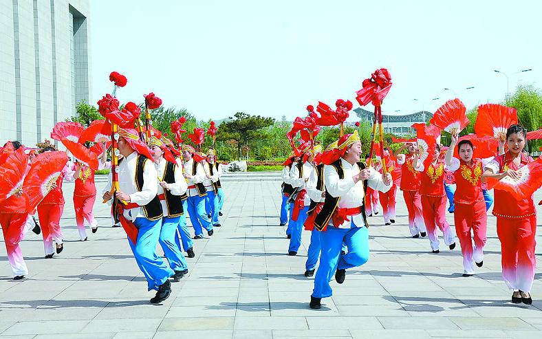 4月25日,出演民間廣場舞《花鼓鑼子》的演員正在市藝術(shù)館廣場上進(jìn)行排練表演。