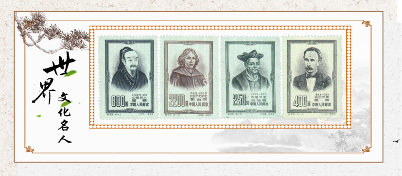 1953年12月30日,為了介紹世界四位文化名人,配合這次紀念活動,郵電部發(fā)行了《世界文化名人》紀念郵票,全套4枚。