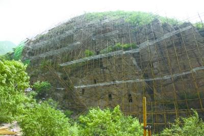 姚家營(yíng)洞穴遺址近日啟動(dòng)修繕,崖壁外側(cè)搭建起高48米、寬130米的腳手架。延慶區(qū)文委供圖