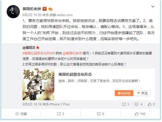 8月2日,黃國倫鳥巢演唱會(huì)第一次微訪談,許多網(wǎng)友向他詢問接下來的形成安排。黃國倫的微博就像一個(gè)記事本,記錄了他和支持他的朋友們每天為“9.23鳥巢演唱會(huì)”付出的一點(diǎn)一滴,毫無保留;卮鹁W(wǎng)友行程安排問題上也是非常坦白:“接下來是票務(wù)啦,十萬人的場(chǎng)子。當(dāng)然還有音樂總監(jiān),我希望你們都來啊,把鳥巢坐滿,大家來了,就一定要呈現(xiàn)最好的音樂現(xiàn)場(chǎng)!