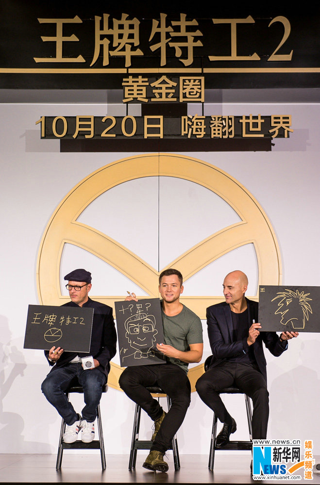 此次《王牌特工2:黃金圈》的中國行可謂亮點(diǎn)頗多,可以說從一落地就開始“瘋狂撩粉“。先是蛋蛋與馬強(qiáng)的機(jī)場(chǎng)照走紅網(wǎng)絡(luò),身穿短褲、拖鞋的隨性蛋蛋和”腿長兩米八“的馬強(qiáng)畫風(fēng)迥異,反差萌瞬間圈粉。之后,兩人又接受了霸氣十足的”黃金蟹“宴席款待,幾十只大閘蟹拼出影片logo吸睛十足,兩人還有模有樣的學(xué)起如何使用蟹八件,入鄉(xiāng)隨俗的程度可謂驚人。最大的亮點(diǎn)來自發(fā)布會(huì),粉絲精心準(zhǔn)備的二次元畫作令主創(chuàng)大開眼界,既有集中國傳統(tǒng)古風(fēng)于一身的“特工奔月圖”讓人眼前一亮,也有“王牌鐵三角”黃金周中國游Q版組圖萌翻全場(chǎng),眾多電影主角畫風(fēng)多變打破次元壁,引得主創(chuàng)紛紛稱贊。欣賞過粉絲畫作后,主創(chuàng)也即興上手搞起創(chuàng)作來,導(dǎo)演馬修·沃恩完美挑戰(zhàn)漢字默寫,“王牌特工2”5個(gè)漢字極其工整,引發(fā)觀眾驚呼,而蛋蛋與馬強(qiáng)則調(diào)皮十足,現(xiàn)場(chǎng)飛速創(chuàng)作,尤其是蛋蛋的自畫像博得一片喝彩,將氣氛引向高潮。最后,三位還獲贈(zèng)了中國古代“著名特工”——錦衣衛(wèi)的令牌作為比拼獎(jiǎng)勵(lì),三位對(duì)禮物愛不釋手,并大擺錦衣衛(wèi)pose,古今中外的特工范兒相映成趣。最后主創(chuàng)齊邀觀眾10月20日走進(jìn)影院,解鎖這場(chǎng)嗨翻世界的精彩!