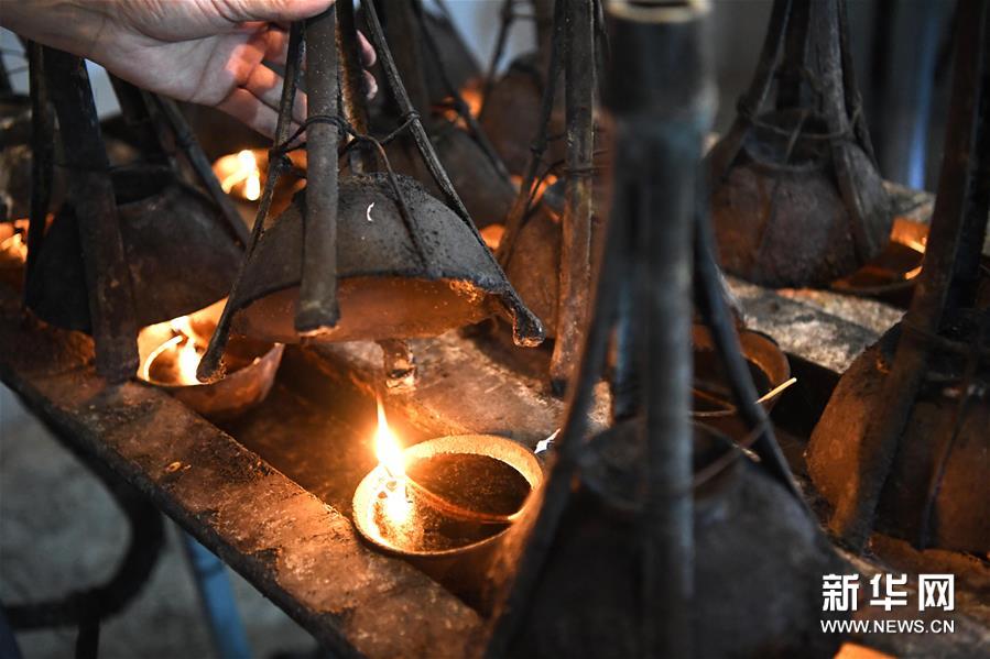 燒煙是古法油煙墨制作的第一道工序,燈油以桐油、豬油、生漆為原料,通過燈草燃燒,用碗覆蓋在油燈上收集油煙。燒煙之后,還有和料、捶打、制墨、晾墨、描金等多道古法制墨工序。制作好的油煙墨豐肌膩理、光澤如漆。 新華社發(fā)(黃博涵攝)