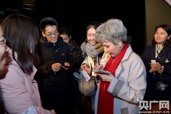 圖為著名滬劇表演藝術(shù)家茅善玉為青年學(xué)子簽名留念。(央廣網(wǎng)發(fā) 上海滬劇院供圖)