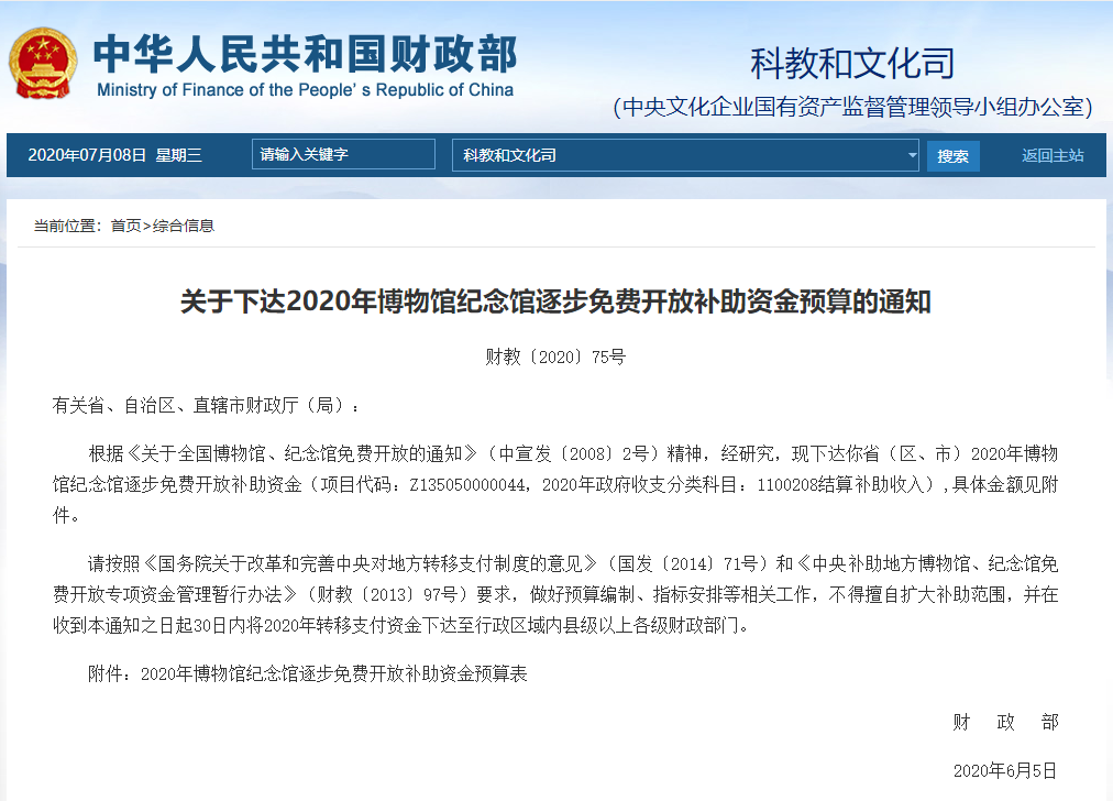 《通知》強調(diào),各省(區(qū)、市)需按照《國務(wù)院關(guān)于改革和完善中央對地方轉(zhuǎn)移支付制度的意見》(國發(fā)〔2014〕71號)和《中央補助地方博物館、紀(jì)念館免費開放專項資金管理暫行辦法》(財教〔2013〕97號)要求,做好預(yù)算編制、指標(biāo)安排等相關(guān)工作,不得擅自擴(kuò)大補助范圍,并在收到《通知》之日起30日內(nèi)將2020年轉(zhuǎn)移支付資金下達(dá)至行政區(qū)域內(nèi)縣級以上各級財政部門。