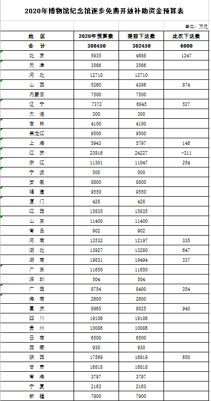 央廣網(wǎng)北京7月8日消息(記者方永磊 實習(xí)記者王紅霞)7月7日,財政部發(fā)布的《關(guān)于下達(dá)2020年博物館紀(jì)念館逐步免費開放補助資金預(yù)算的通知》。通知顯示,2020年財政部合計向36個地區(qū)下達(dá)308450萬元補助資金,13個地區(qū)補助資金預(yù)算數(shù)超1億。其中,江蘇預(yù)算最多,為23916萬元,其次分別為湖南和四川,補助資金預(yù)算分別為19831萬元和19106萬元。