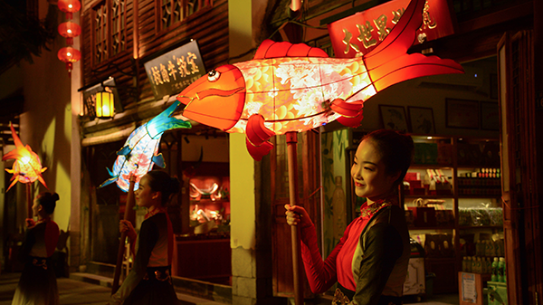 演出結(jié)束后,表演者輕晃錦鯉燈籠恭送賓客(央廣網(wǎng)發(fā) 嚴南悅攝)