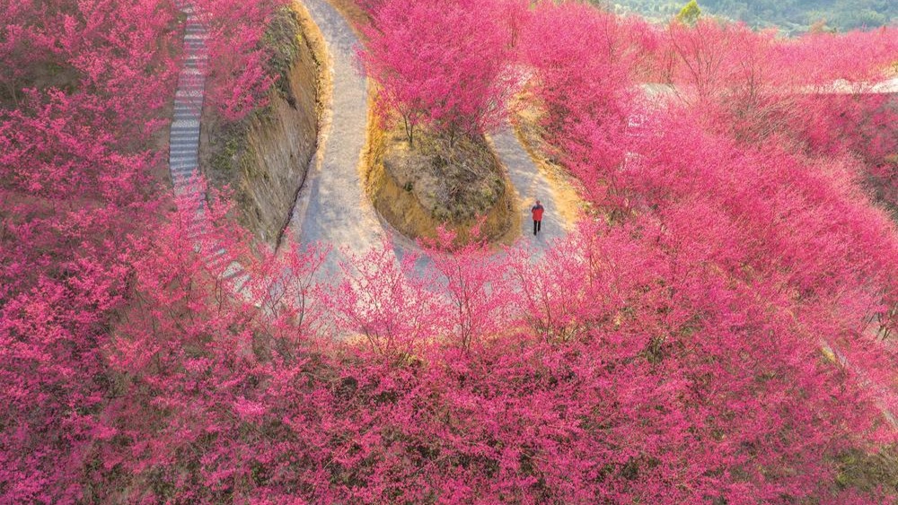 2月13日,永泰縣梧桐鎮(zhèn)三富村的小喜農(nóng)場(chǎng)櫻花綻放,為當(dāng)?shù)卦鎏砹艘荒▌e樣的春日色彩。