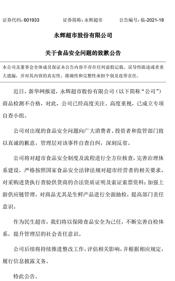 4月16日,永輝超市發(fā)布關(guān)于食品安全問題的致歉公告:公司對出現(xiàn)的食品安全問題向廣大消費者、投資者和監(jiān)管部門致以真誠的歉意,管理層對該事件自查自糾,深刻反省。