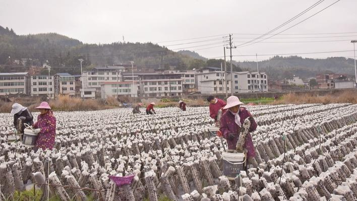 連日來,在大田縣廣平鎮(zhèn)元沙村黑木耳基地,村民穿梭于菌棒間采摘、裝筐、搬運。