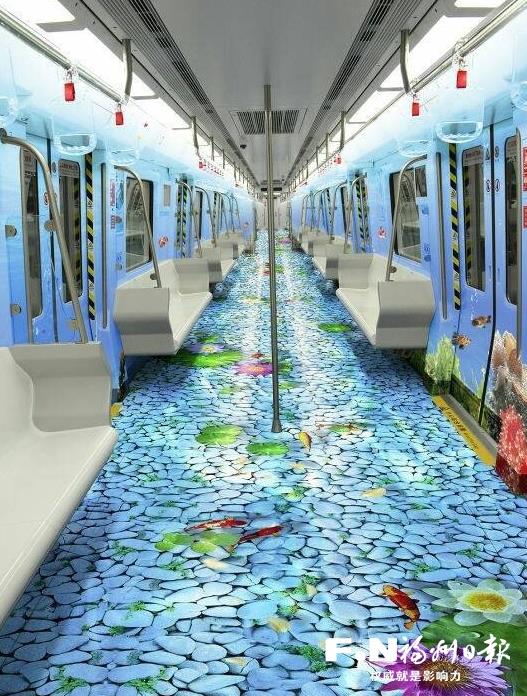 微博博主“福州地鐵迷”發(fā)布了幾張地鐵列車內的照片,并配文:“福州地鐵新彩繪車廂出爐,這次以清新靈動為創(chuàng)意主線,主題為金魚,小鐵感覺,仿佛到了水族館!痹3張照片中,記者看到,車廂兩側整體為藍色調,腳下“鋪滿”鵝卵石,多尾形態(tài)、顏色各異的金魚在水草間歡快游動。