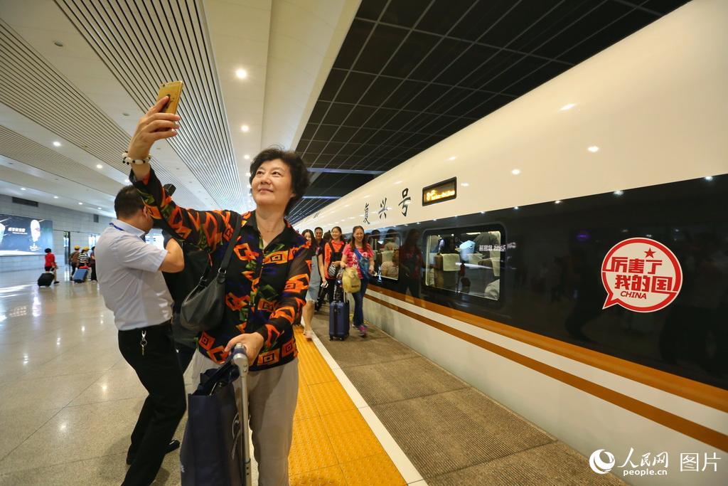 來自南京的馬女士在“復(fù)興號”前自拍留念。王初 攝 人民網(wǎng)上海9月21日電 ( 肖云峰、單芳、王初)9月21日零時起,全國鐵路實行新的列車運行圖,7對“復(fù)興號”動車組列車在京滬高鐵線率先實現(xiàn)350公里時速運營,京滬高鐵邁進達速新時代。 據(jù)悉,鐵路部門精心設(shè)計京滬高鐵達速方案,安排7對“復(fù)興號”動車組分別擔(dān)當(dāng)G1/G2、G3/G4、G5/G6、G7/G8、G9/G10、G13/G14、G17/G18次,在京滬高鐵線按時速350公里運行,全程運行時間在4個半小時左右,進一步縮短京滬兩地間時空距離。 “復(fù)興號”動車組列車是按照時速350公里運營研發(fā)制造的中國標(biāo)準(zhǔn)動車組,集成了大量現(xiàn)代高新技術(shù),其安全性、經(jīng)濟性、舒適性以及節(jié)能環(huán)保等性能有較大提升。該列車率先在京滬高鐵實現(xiàn)350公里時速運營,為沿線各大中心城市之間人民群眾出行提供了更多的選擇,更好地滿足了廣大旅客對不同速度等級高鐵運輸?shù)男枨蟆? 相關(guān)新聞:時速350公里!實拍“復(fù)興號”達速運行前的“體檢” -