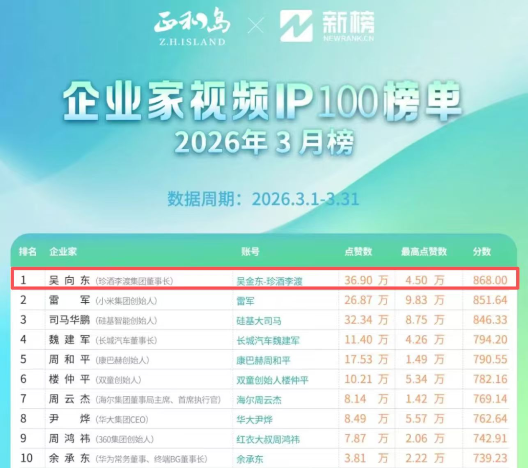 4月11日,正和島聯(lián)合新榜發(fā)布2026年3月《企業(yè)家視頻IP100榜單》,吳向東榮登榜首,這也是繼今年1—2月登頂之后,吳向東蟬聯(lián)該榜單榜首。