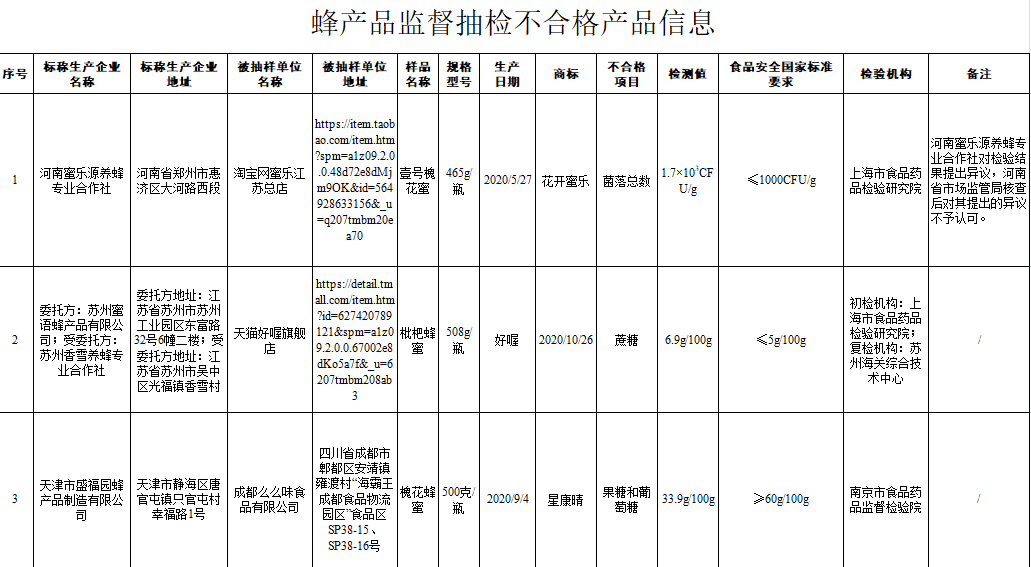 《通告》顯示,商標(biāo)名稱為“花開蜜樂”、標(biāo)稱河南蜜樂源養(yǎng)蜂專業(yè)合作社生產(chǎn)的壹號(hào)槐花蜜,經(jīng)上海市食品藥品檢驗(yàn)研究院檢驗(yàn)發(fā)現(xiàn),其中菌落總數(shù)不符合食品安全國家標(biāo)準(zhǔn)規(guī)定。河南蜜樂源養(yǎng)蜂專業(yè)合作社對(duì)檢驗(yàn)結(jié)果提出異議,河南省市場(chǎng)監(jiān)管局核查后對(duì)其提出的異議不予認(rèn)可。