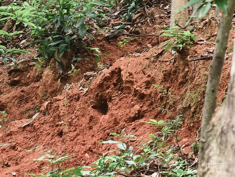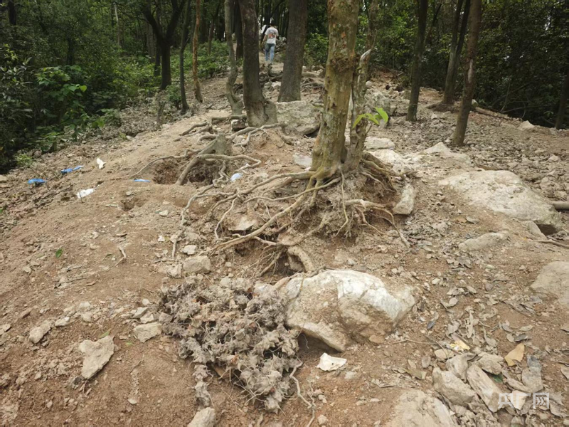 “挖水晶”導(dǎo)致山體裸露,個(gè)別樹根裸露、地表出現(xiàn)孔洞(央廣網(wǎng)發(fā) 黃埔區(qū)委宣傳部供圖)