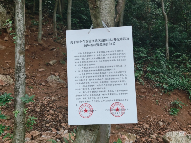 告知書明確,私挖水晶屬于違法行為:黃埔區(qū)轄區(qū)山體出現(xiàn)擅自開挖水晶、破壞植被及地形地貌的行為,已對(duì)森林資源和生態(tài)環(huán)境造成損害,違反《中華人民共和國(guó)森林法》《中華人民共和國(guó)礦產(chǎn)資源法》等法律法規(guī)相關(guān)規(guī)定。