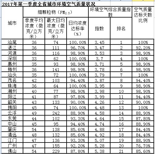 在備受關(guān)注的地市空氣質(zhì)量排名方面,根據(jù)環(huán)境空氣質(zhì)量綜合指數(shù)排名,我省各地級(jí)以上市排名依次為:汕尾、湛江、河源、深圳、惠州、梅州、汕頭、茂名、珠海、潮州、陽(yáng)江、韶關(guān)、揭陽(yáng)、云浮、東莞、中山、肇慶、清遠(yuǎn)、江門、廣州、佛山。在此前2015年和2016年的全年排名中,汕尾、湛江也排名全省前兩名。