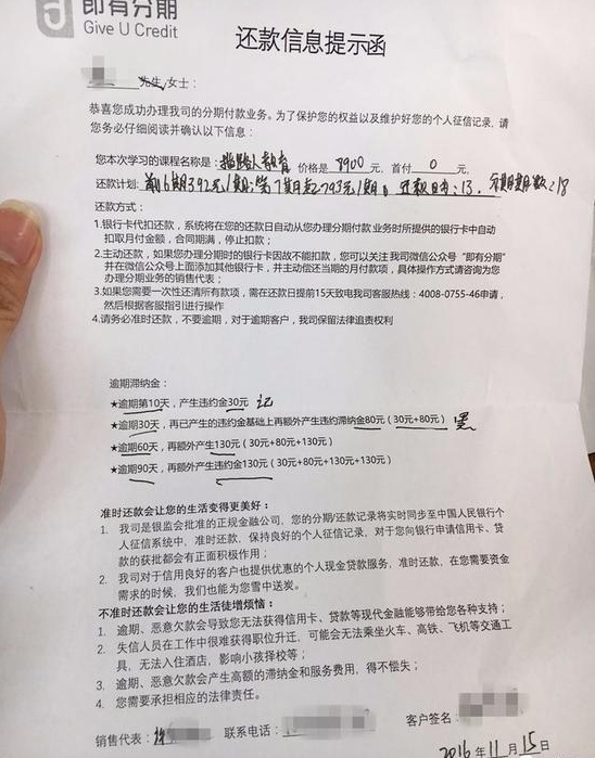 去年11月15日,小英再次來(lái)到指路人公司,完成一份貸款合同和《藍(lán)海計(jì)劃項(xiàng)目協(xié)議書(shū)》的簽訂。協(xié)議書(shū)顯示,小英學(xué)習(xí)費(fèi)用選擇為分期付款,由第三方金融機(jī)構(gòu)“即有分期”代為支付,分期數(shù)為18個(gè)月,前6個(gè)月每月還款為392元,后12個(gè)月每月還款為793元。如此計(jì)算下,小英此次的貸款總金額過(guò)萬(wàn)元。