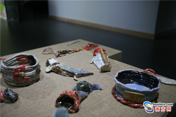 6月15日,廣州市文瀛藝術(shù)高地美術(shù)館的墻面上整齊地懸掛著裝裱精致的繪畫作品;木質(zhì)展臺(tái)上陳列著色彩斑斕的陶藝制品,在燈光照射下閃閃發(fā)亮。