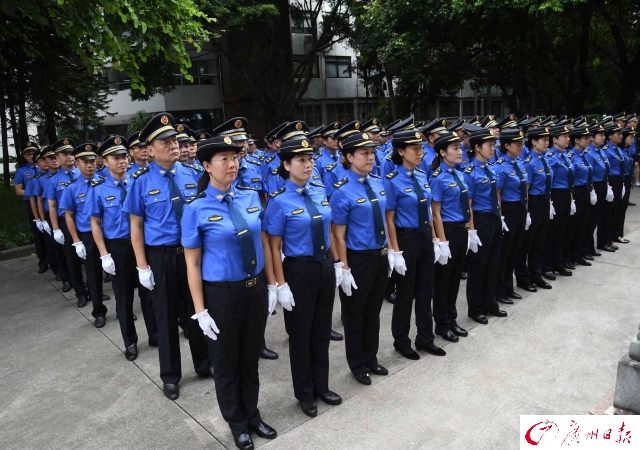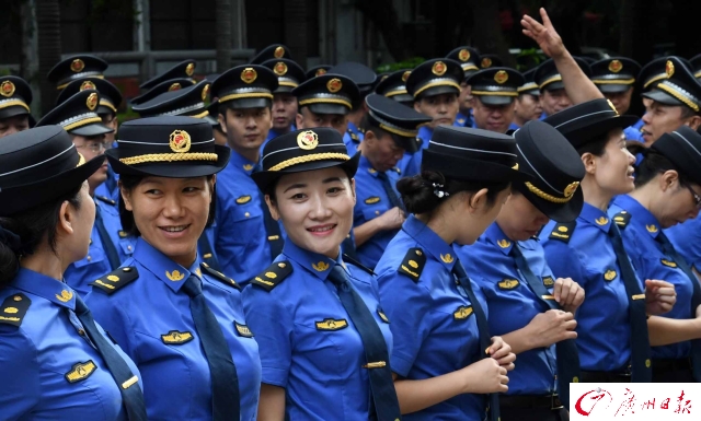 大洋網(wǎng)訊 10月1日起,廣州市城管執(zhí)法將換上全國統(tǒng)一服裝。9月29日,市城管委舉行換裝儀式,全體人員換上藍色系新制服。