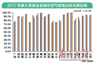 通報(bào)顯示,2017年第三季度與去年同期相比,全省城市空氣質(zhì)量達(dá)標(biāo)天數(shù)比例(優(yōu)良天數(shù)比例)平均為89.2%,較去年同期提高0.2個(gè)百分點(diǎn)。珠三角城市空氣質(zhì)量達(dá)標(biāo)天數(shù)比例平均為82.3%,較去年同期提高1.2個(gè)百分點(diǎn)。2017年1-9月,全省空氣質(zhì)量達(dá)標(biāo)天數(shù)比例達(dá)90.8%。