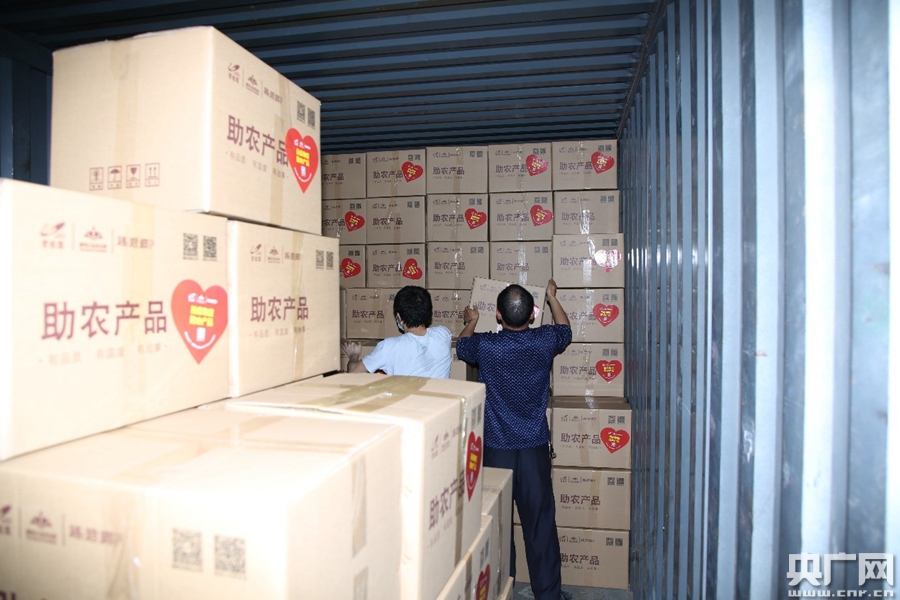 工作人員在裝載物資。(央廣網(wǎng)發(fā))