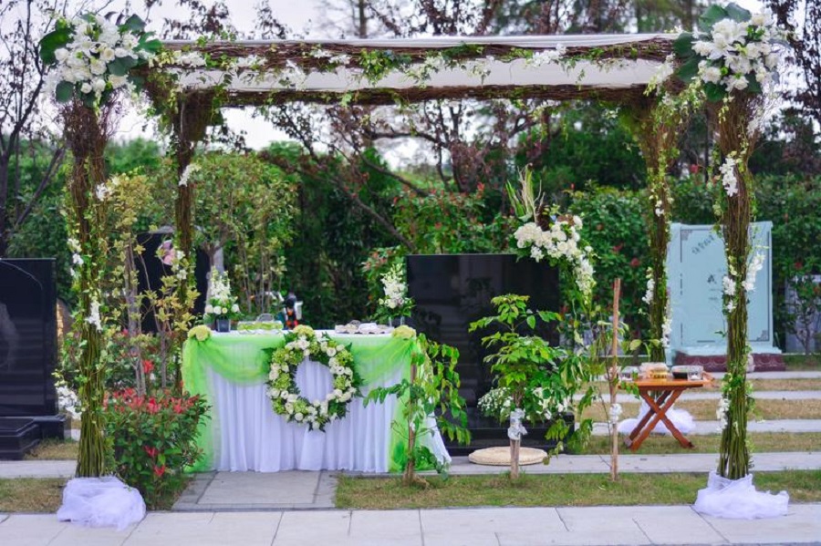 白玫瑰,綠帳幔,小風鈴,水晶吊墜,羅馬柱,以及用若干老照片做成的“時光通道”,上面是一對夫婦從黑發(fā)到白頭的合影留念。如果沒有看到桌面上擺放的兩只靈盒,許多人可能會誤以為這是一對金婚夫婦的紀念日現(xiàn)場,畢竟鮮少有人能將這些唯美而溫馨的元素與葬禮聯(lián)系到一起。