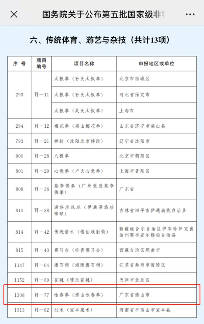 央廣網(wǎng)佛山6月10日消息(記者張勝強 通訊員佛宣)6月10日,第五批國家級非物質(zhì)文化遺產(chǎn)代表性項目名錄公布,其中由佛山市申報的詠春拳(佛山詠春拳)正式入選。