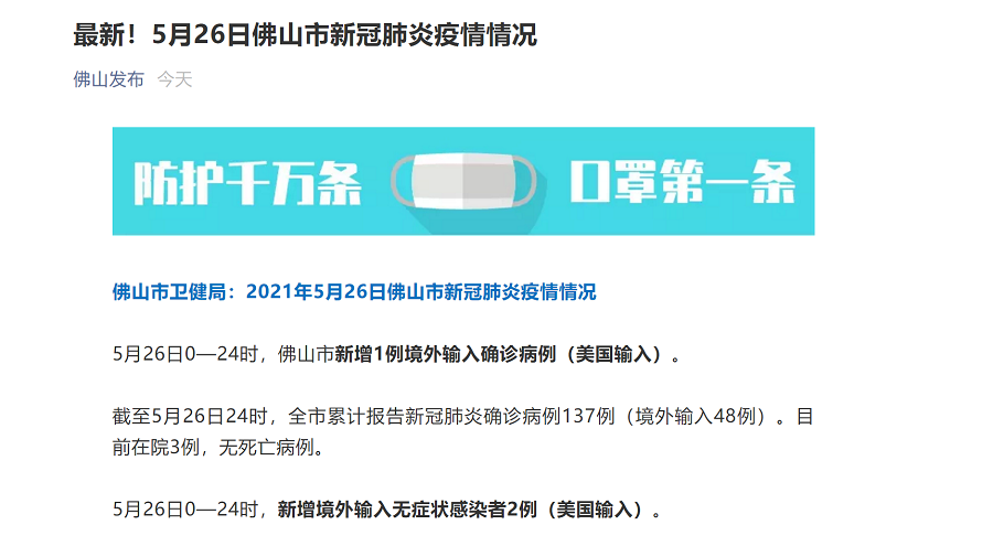 央廣網(wǎng)佛山5月27日消息(記者 周羽 鄭澍)5月27日,據(jù)佛山市衛(wèi)健局消息,5月26日0—24時(shí),佛山市新增1例境外輸入確診病例(美國(guó)輸入)。