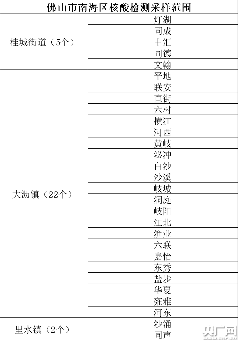 佛山市南海區(qū)核酸檢測(cè)采樣范圍(央廣網(wǎng)記者 夏燕 制表)