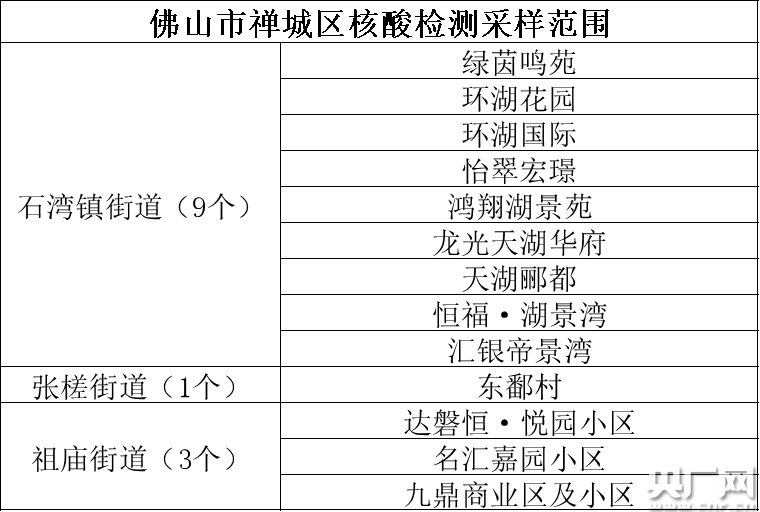 佛山市禪城區(qū)核酸檢測(cè)采樣范圍(央廣網(wǎng)記者 夏燕 制表)