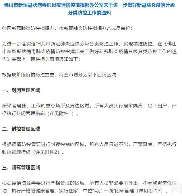 央廣網(wǎng)佛山6月6日消息(記者 夏燕)6月5日晚,佛山市新型冠狀病毒肺炎疫情防控指揮部辦公室發(fā)布通知,即日起實(shí)施分級(jí)分類防控,將全市劃分為封閉管理、封控管理、閉環(huán)管理及一般管理共四類區(qū)域。