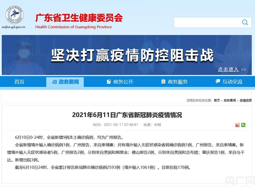 據(jù)廣東省衛(wèi)健委通報(bào):6月10日0-24時(shí),廣東全省新增9例本土確診病例,均為廣州報(bào)告。