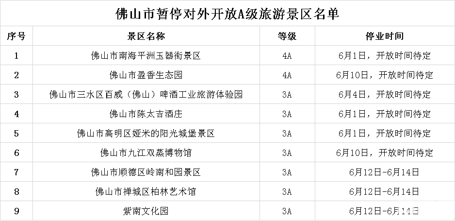 央廣網(wǎng)佛山6月11日消息(記者 張勝強、通訊員 佛宣)端午假期臨近,佛山市文化廣電旅游體育局發(fā)布《關(guān)于做好2021年“端午”假期疫情防控和安全工作的通知》(以下簡稱“通知”)。受疫情影響,全市9家A級景區(qū)暫停開放,重新開放時間待定。