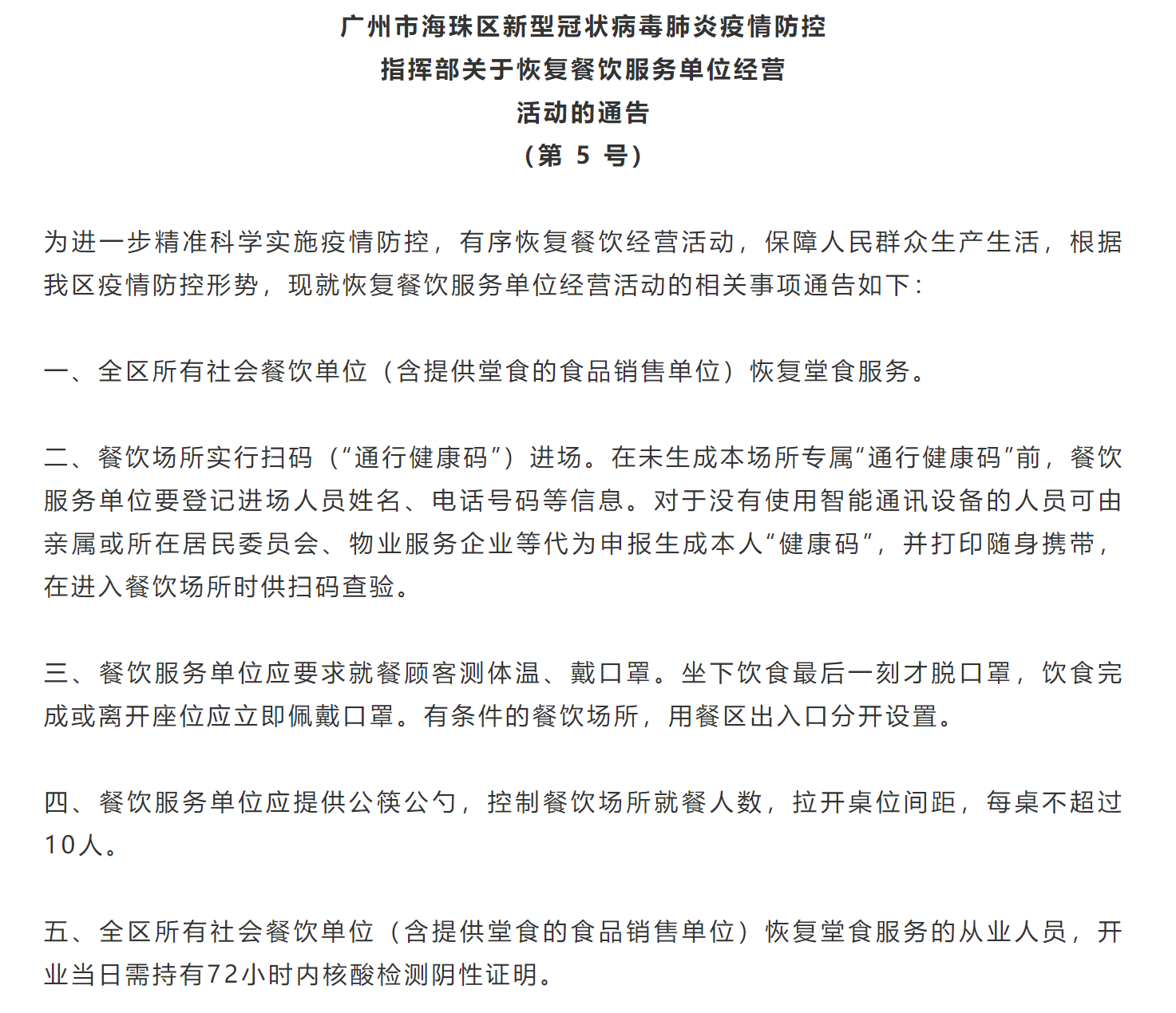 關(guān)于逐步放寬餐飲服務(wù)單位經(jīng)營活動的通告