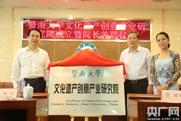 國務(wù)院僑辦辦公室譚天星副主任、暨南大學(xué)胡軍校長以及陳平女士為文化遺產(chǎn)創(chuàng)意產(chǎn)業(yè)研究院揭牌(攝影:王通)