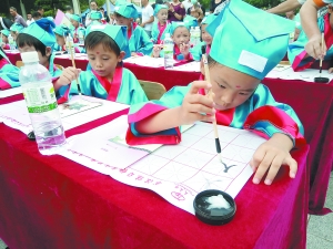 據(jù)廣州日?qǐng)?bào)報(bào)道,昨日上午,江門蓬江區(qū)近500名小學(xué)一年級(jí)新生及其家長(zhǎng)來(lái)到茅龍書(shū)院獻(xiàn)章堂前,舉行傳統(tǒng)的“開(kāi)筆禮”暨五邑優(yōu)秀傳統(tǒng)家訓(xùn)誦讀活動(dòng);顒(dòng)按傳統(tǒng)開(kāi)筆禮儀式,舉行了正衣冠、拜先師、點(diǎn)朱砂、寫(xiě)“人”字等儀式。