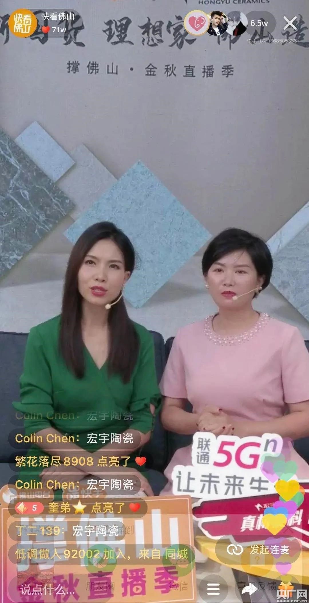據(jù)了解,首批亮相5G直播室的有宏宇陶瓷、萬(wàn)和電氣、聯(lián)邦家私、格蘭仕、東鵬陶瓷、佛山照明等品牌企業(yè)。其中,首場(chǎng)佛山企業(yè)—宏宇陶瓷專(zhuān)場(chǎng),半小時(shí)點(diǎn)贊量超過(guò)100萬(wàn),最高實(shí)時(shí)在線人數(shù)近8萬(wàn)。