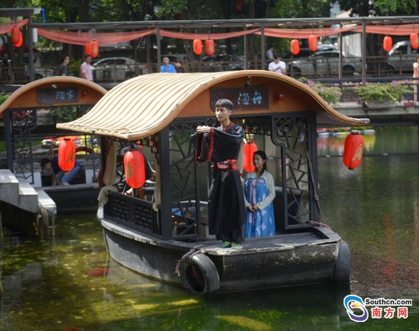 入場儀式過后,上演“彈絲樂禮”古箏彈唱表演,古代君王們功業(yè)成就才做樂,天下平定了才成禮。隨后接著的“嶺南舞韻”更是增添了宴會上的歡愉氣氛。在紅云宴期間湖面上還有緩緩行駛的一條船,船上一人舉酒杯,一人捧酒缽。船隨岸而行,每到坐客處即停。客人便取杯飲酒,將杯還給舉酒杯的人,捧酒缽人斟酒滿杯,船再前行。