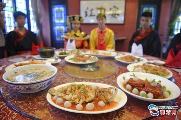 當然紅云宴為何重現(xiàn)傳統(tǒng)的場景也并不只有菜肴。上午9時30分,“六月六,紅云宴”開始,一群身穿南漢服裝的大臣和侍女等候在宴會廳外迎接貴賓。賓客入場后,施禮官介紹本次紅云宴活動,為活動正式開場。