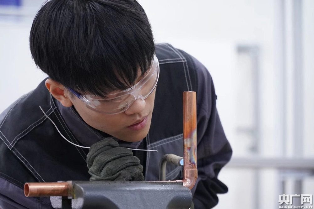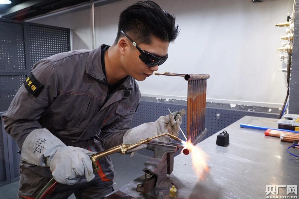 圖為參加第一屆全國技能大賽制冷與空調(diào)項目的選手正在焊接。(央廣網(wǎng)記者 官文清 攝)