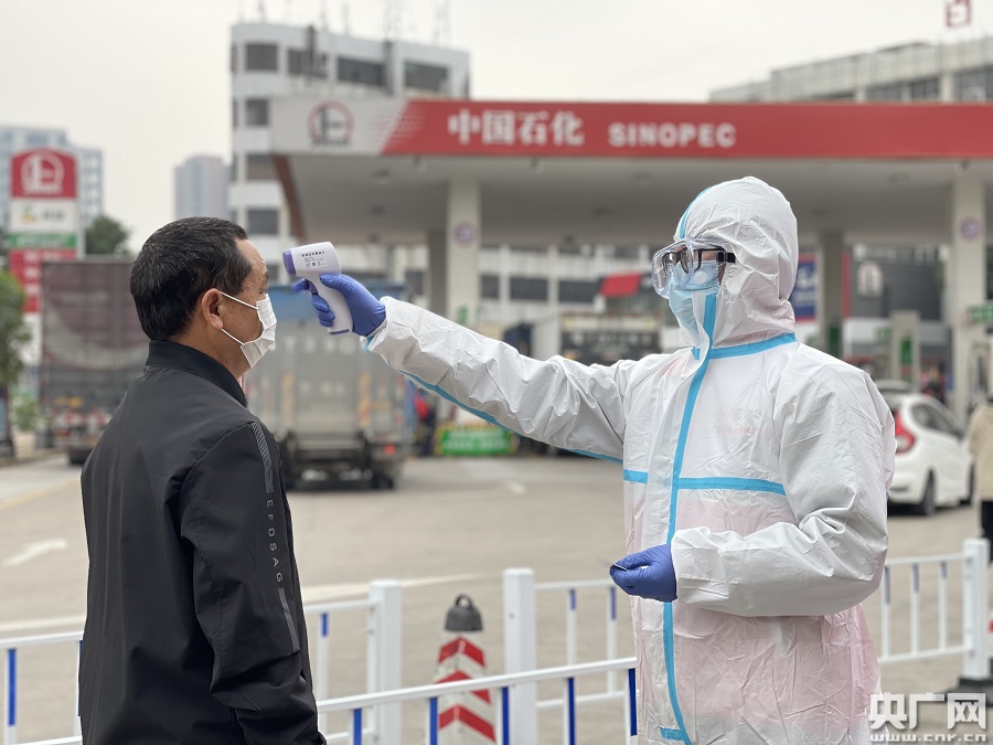 “情暖驛站”工作人員為旅客測(cè)量體溫。(央廣網(wǎng)發(fā) 通訊員供圖)