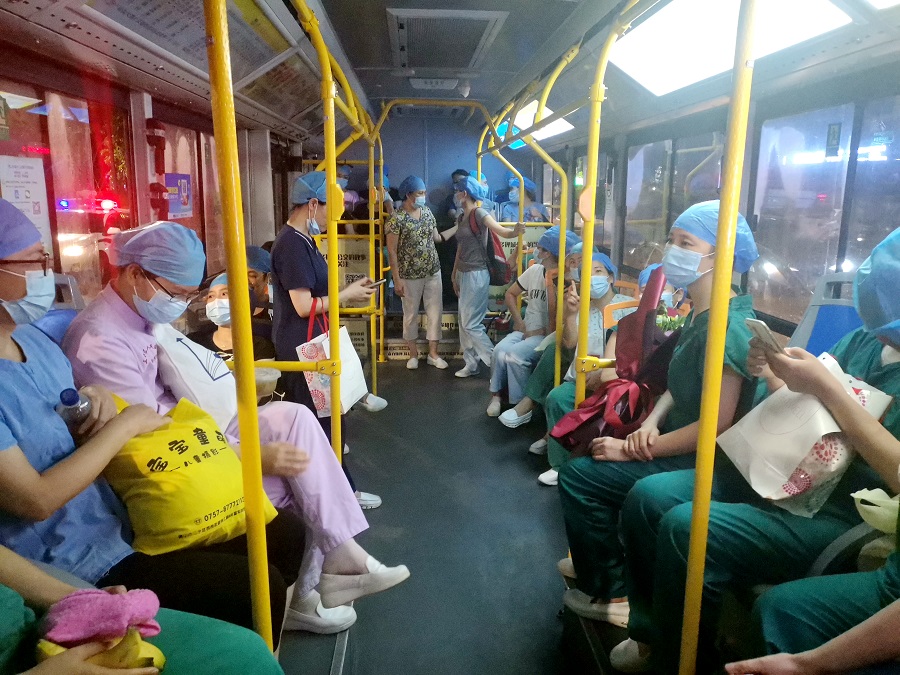 醫(yī)護(hù)人員乘坐公交車。(央廣網(wǎng)發(fā))