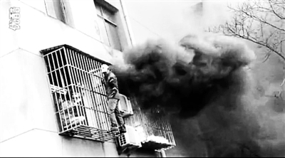 在這條10分鐘左右的視頻中,一棟居民樓中的一間屋子著火,火苗已躥出窗外,并伴有大量黑煙。在著火屋子的隔壁房間,一名女子站在陽臺(tái)防盜網(wǎng)里等待救援。而在防盜網(wǎng)外,一名身穿紅色外套、頭戴白色帽子的男子,沿著防盜網(wǎng)之間的空隙慢慢移動(dòng),試圖救出這名女子。