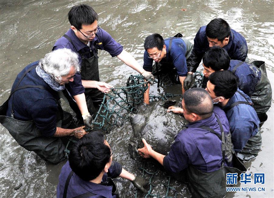 4月7日,中外動(dòng)物專家和飼養(yǎng)員將蘇州動(dòng)物園池塘內(nèi)的雌性斑鱉抬上岸。
