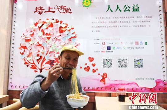 蘭州本地5家牛肉面連鎖品牌加入“墻上有愛(ài),人人公益”愛(ài)心牛肉面活動(dòng)。用餐的人提前購(gòu)買(mǎi)牛肉面,將購(gòu)得的小票貼在墻上并寫(xiě)上祝福語(yǔ),任何一位需要就餐卻遇到困難的食客,都可以將墻上的小票撕下來(lái)交到收銀臺(tái),免費(fèi)享用牛肉面。圖為活動(dòng)園地。 楊艷敏 攝