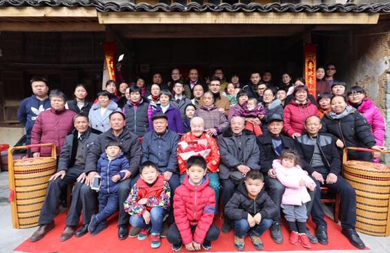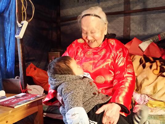 而今,老人五世同堂,玄孫抱膝,享受晚年幸福生活。