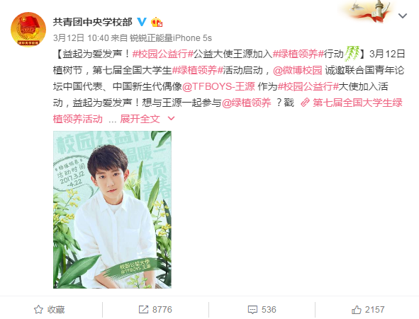 今年,王源、許魏洲、楊千嬅等眾多明星成為本屆活動(dòng)的校園公益大使。明星大使通過(guò)短視頻號(hào)召大家加入到綠植領(lǐng)養(yǎng)活動(dòng),在校園中踐行公益,截止目前王源、楊千嬅、包貝爾、劉璇的四條短視頻播放量近1000萬(wàn)次。在線上活動(dòng)啟動(dòng)當(dāng)天,@TFBOYS-王源 3月12日發(fā)布自己擔(dān)任校園公益行公益大使的微博,該條微博互動(dòng)量超過(guò)642萬(wàn),轉(zhuǎn)發(fā)量突破607萬(wàn)。明星名人在公益推廣上發(fā)揮著巨大的作用,據(jù)微博數(shù)據(jù)顯示2016年微博明星名人發(fā)布的公益話題閱讀量超過(guò)300億次,本次校園公益行邀請(qǐng)王源、許魏洲等在學(xué)生群體中有眾多粉絲和巨大影響力的明星作為公益大使,充分調(diào)動(dòng)了學(xué)生群體參與公益的積極性,讓大家自發(fā)參與到公益活動(dòng)中。