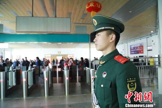 武警福建省總隊龍巖支隊官兵在龍巖火車站檢票口執(zhí)勤。 郭大偉 攝