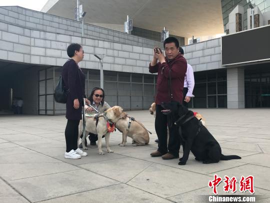 4位盲人在各自導(dǎo)盲犬的帶領(lǐng)下進(jìn)入公共場(chǎng)所!铎o 攝